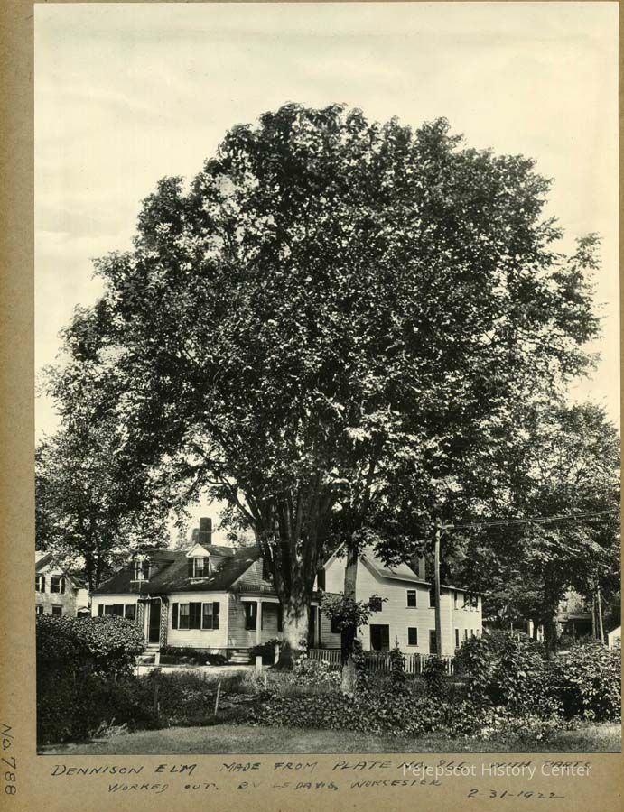 A sepia toned photo of the Dennison Elm. Behind it is the Dennison House. At bottom is written, "Dennison Elm made from plate No. 866 with parts worked out. By LE Davis, Worcester. 2-31-1922."