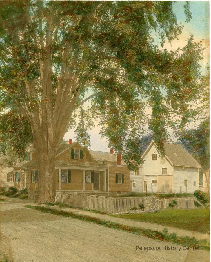 A colored photo of the Dennison Home on Everett Street labeled "The original Dennison Plant". In plain brown wood frame. On back of photo "Some additions to the original to make it more liveable for some tenants." Caretaker for many years was Mabel Weston Chandler.