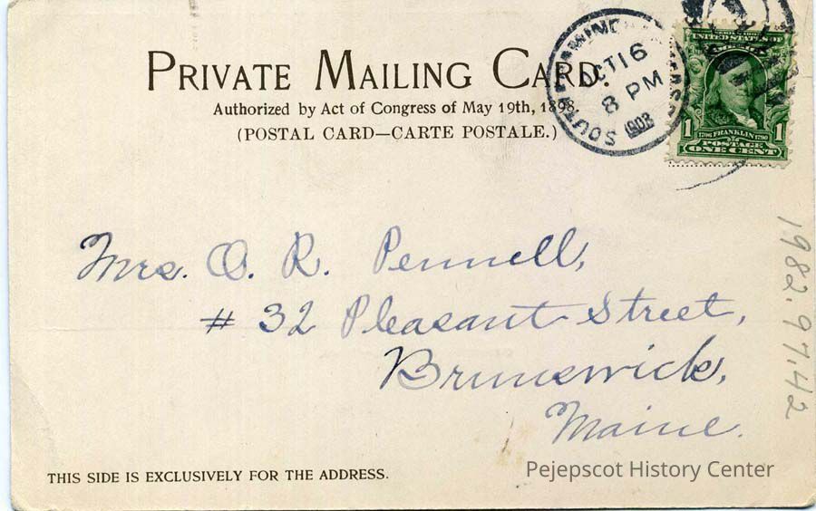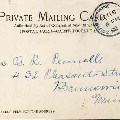 On the back is written, in pen: "Mrs. O.R. Pennell, #32 Pleasant Street, Brunswick, Maine." Postmark is for Oct. 16, 1903Collection