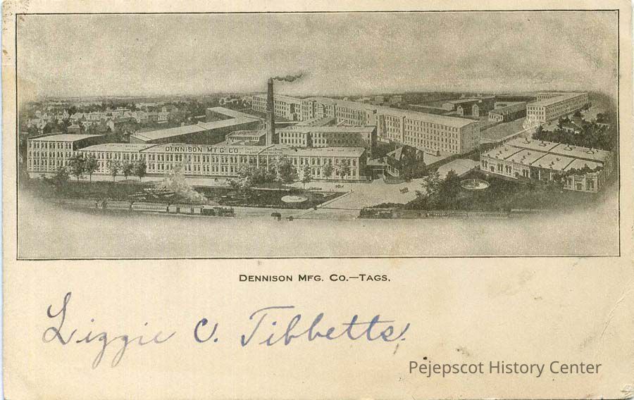 Postcard with a black and white drawing of Dennison Manufacturing Company. The front is printed with the image and the text "Dennison Mfg. Co. - Tags." In pen is written "Lizzie C. Tibbetts".