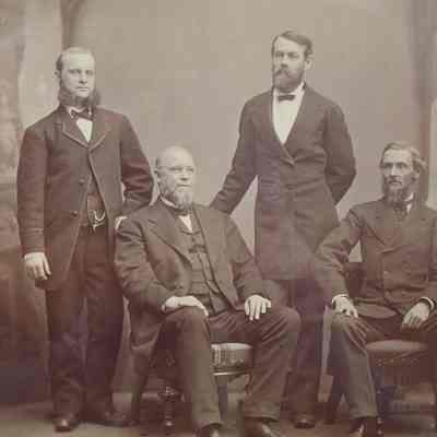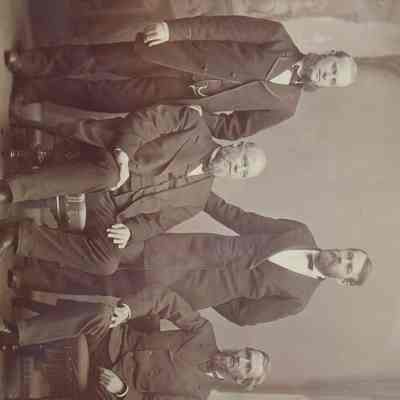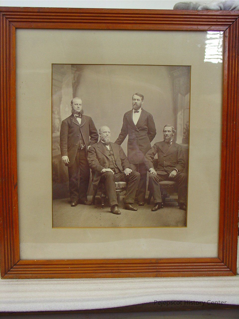 Framed, matted B&W of four businessmen, members of the Dennison Manufacturing Company Board of Directors. They are, from left to right: H.B. Dennison, E.W. Dennison, Henry Hawks, & Albert Metcalf. The frame is relatively wide, flat with ridges, board backing. The backing paper is all gone. Overall size: 52.5 cm h x 47.25 cm w x 2 cm d. Brunswick, Maine. Undated.Lexicon