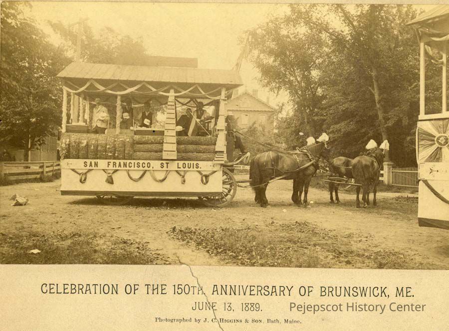 A sepia toned photo of the Brunswick 150th Anniversary parade. This is a Dennison Manufacturing Company float, with "San Francisco. St. Louis." written on the side. The float is decorated with large pieces of wood, most likely as a tribute to the source of Dennison's paper. Dated 06/13/1889.