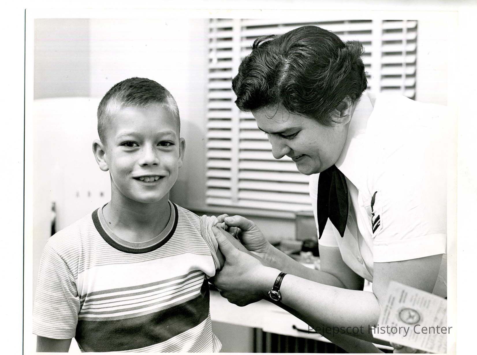 "Shot day is a pleasure for this young lad, a naval dependent, as he receives a small pox inoculation from Betty Leo, HM2, Corps Wave attached to Dependent's Clinic of the Station Hospital. On scheduled inoculation days the clinic's staff administer typhoid, tetanus, small pox, polio, and many other shots to serve the dependents." Stamped on the back are "U.S NAVAL AIR STATION BRUNSWICK, MAINE", "OFFICIAL PHOTOGRAPH NOT TO BE USED FOR PUBLICATION BY ORDER OF THE CHIEF OF NAVAL OPERATIONS", and "RELEASED IF PUBLISHED CREDIT MUST BE GIVEN AS FOLLOWS 'OFFICIAL PHOTOGRAPH U.S. NAVY'" UndatedLexicon