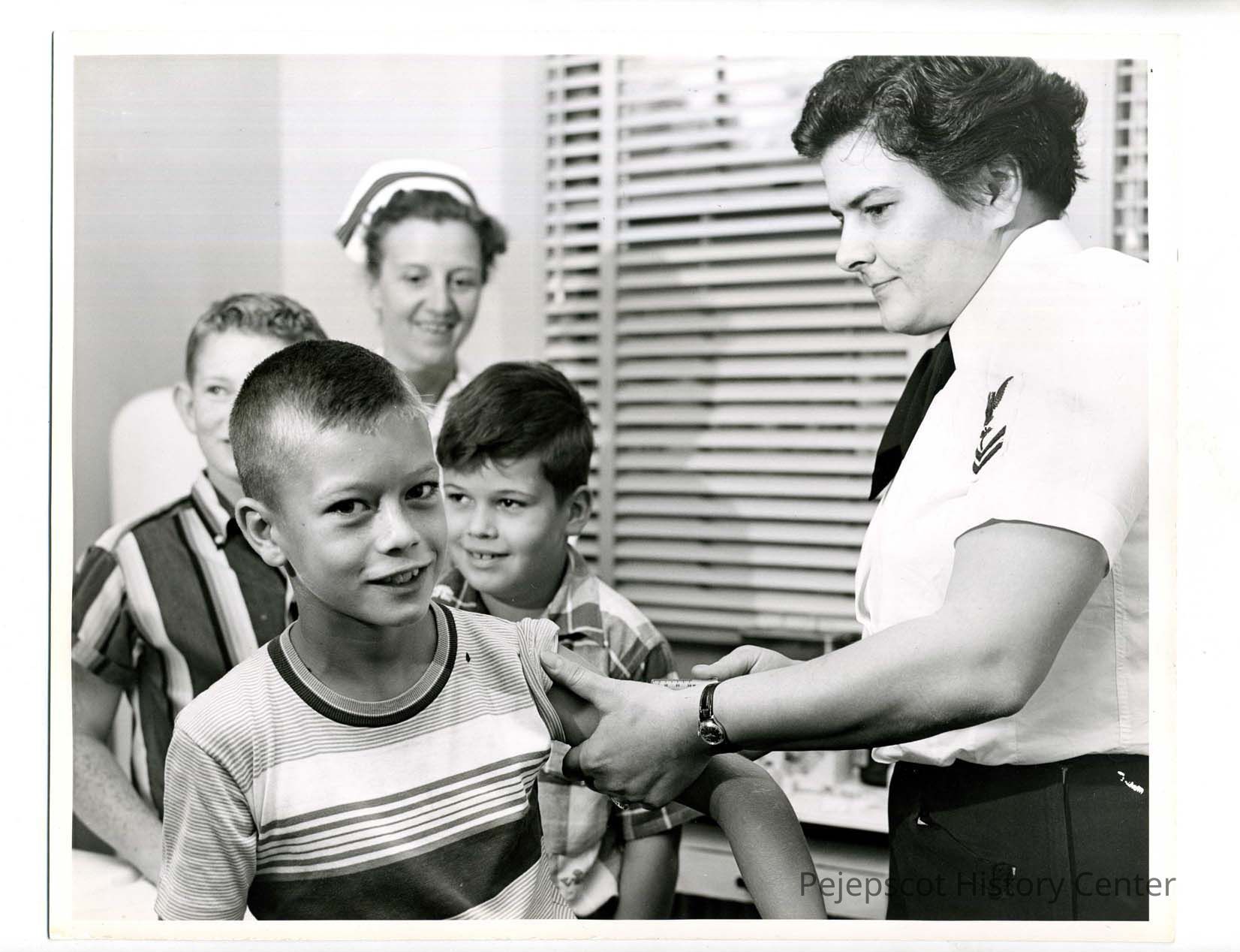 Betty Leo, HM2 gives a small pox inoculation to a young Navy dependent at the Dependent's Clinic at the BNAS Hospital. The photo bears three stamps "U.S NAVAL AIR STATION BRUNSWICK, MAINE", "OFFICIAL PHOTOGRAPH NOT TO BE USED FOR PUBLICATION BY ORDER OF THE CHIEF OF NAVAL OPERATIONS", and "RELEASED IF PUBLISHED CREDIT MUST BE GIVEN AS FOLLOWS 'OFFICIAL PHOTOGRAPH U.S. NAVY'" UndatedLexicon