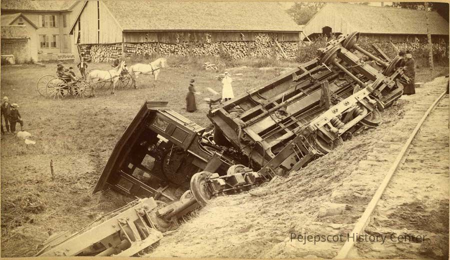 A sepia-toned photo of a derailed train. August 13, 1889.