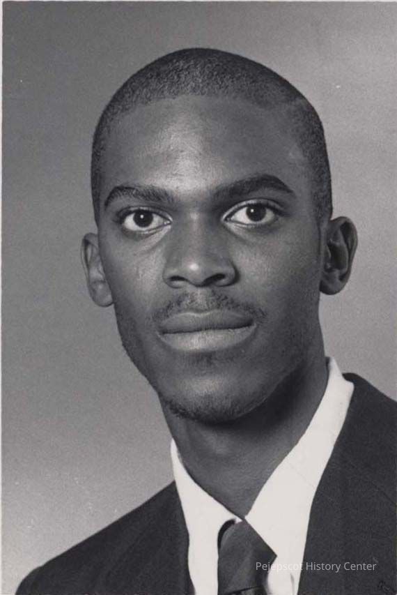 A black and white photo of Derrick Hodge, a graduate of Morse High School, was published in The Times Record in Brunswick, Maine, on 3/6/1991. Hodge, a basketball standout, attended the University of Maine, where he also excelled at basketball.Collection