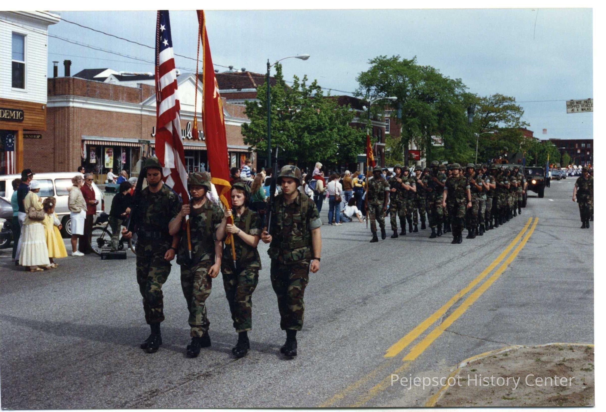 A color photograph of Marines marching in the Desert Storm Welcome Home parade on Maine Street in Brunswick.