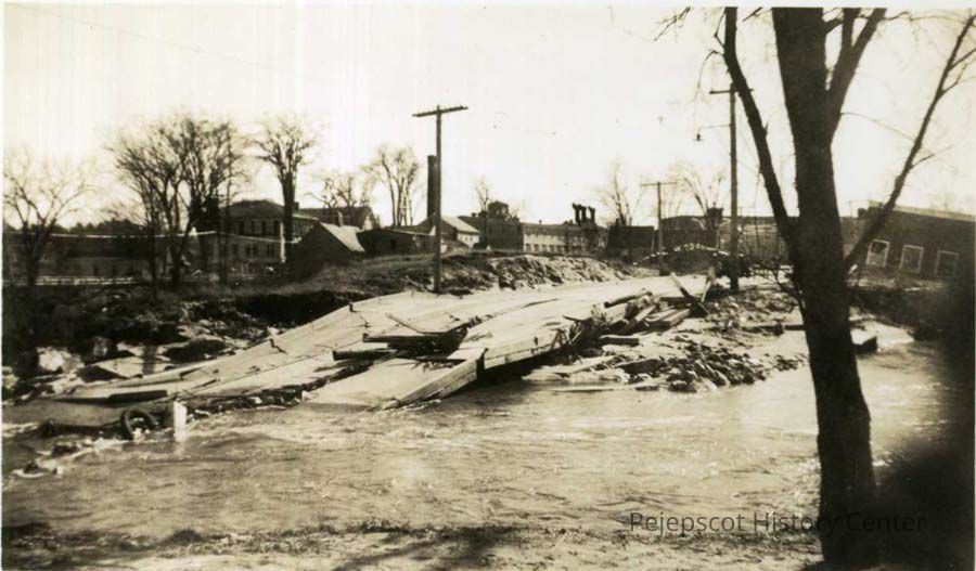 A B/W photograph of the destruction along Main Street Topsham during the 1936 flood. Undated