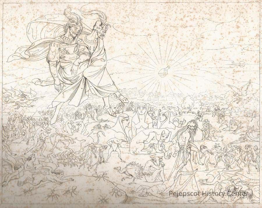 A B/W engraving of the devil carrying through the air the sleeping or dead body of a nobleman. A crowd of gruesome figures looks on from the ground.