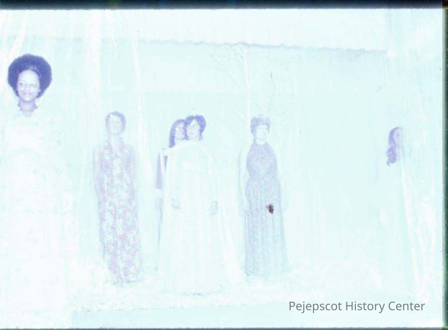 Left to right: Contestant Diana Johnson; Past Winners Louise Ouellette Caron; Agnes Racine standing behind Doris Bernier, Kristina Warming. Person on far right might be Sharon Hinckley. This slide was completely black. Undated