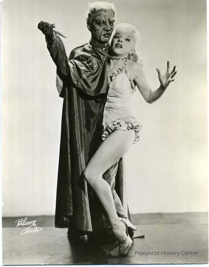 An undated black and white photograph of Diane Parker, the Zombie Girl, with a prop zombie. The photograph was taken by Bloom of Chicago. This is one of 19 photographs of entertainers at the State Hotel, 192 Maine Street, Brunswick. The photographs have been removed from their frames.