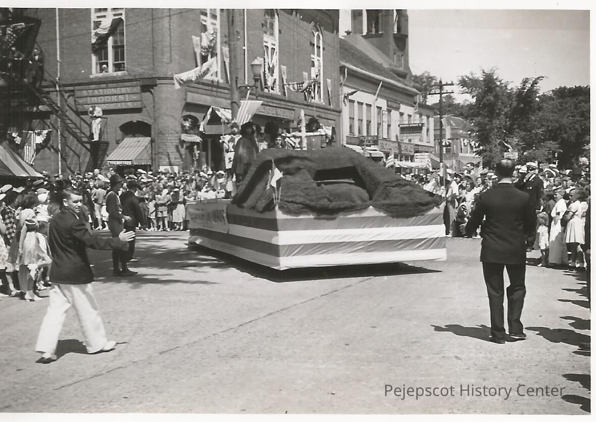 A B/W photo of a man directing a float around the corner at Pleasant and Maine Streets in Brunswick's 200th Anniversary parade. Undated