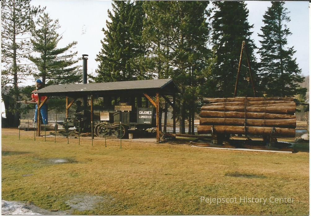 A color photograph of a display of a Lombard Log hauler. "Neg set 3.95.1.7 S. B. Munier photo." is written on the bottom of the backside of the photo. Dated 03/13/1995.