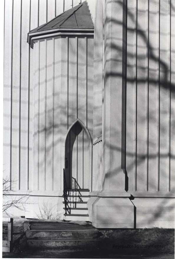 A B/W photograph of a doorway at the First Parish Church. Undated