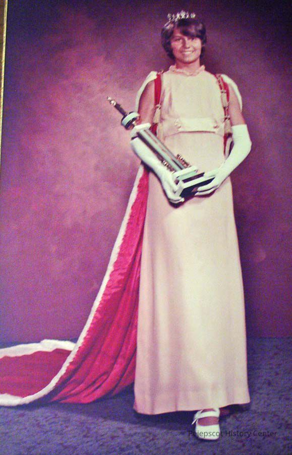 A color photograph of the winner of the 1971 Miss Teen Queen Pageant. Her name is Doris Bernier. She is wearing one of the tiaras and the red cape (2018.73.169) UndatedLexicon