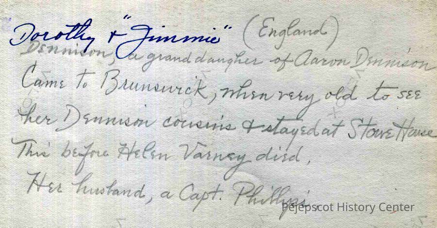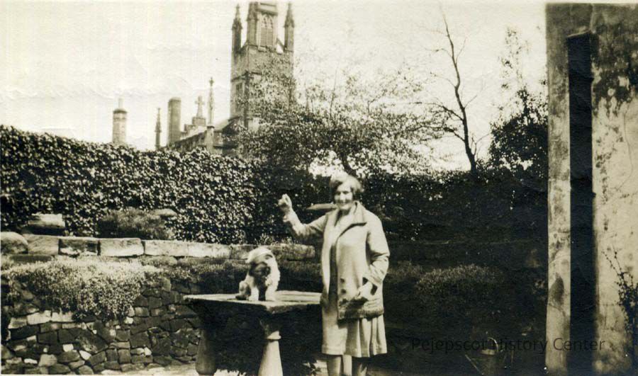 An undated black and white photograph of Dorothy Dennison and her dog Jimmie in England. The back reads in part: "Dorothy and "Jimmie" (England), Dennison, a granddaughter of Aaron Dennison. Came to Brunswick when very old to see her Dennison cousins and stayed at Stowe House. This before Helen Varney died. Her husband, a Capt. Phillips, ..."