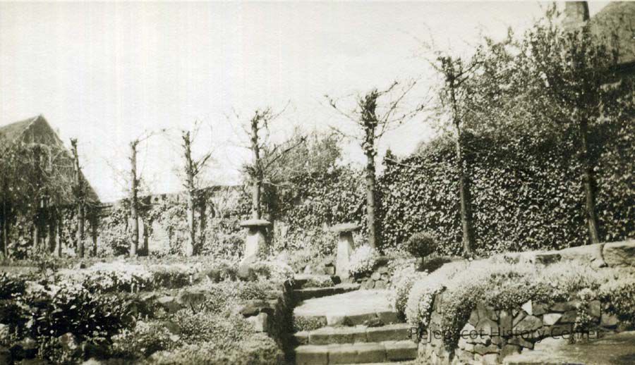 An undated black and white photograph of Dorothy Dennison's garden, Warwick, England.