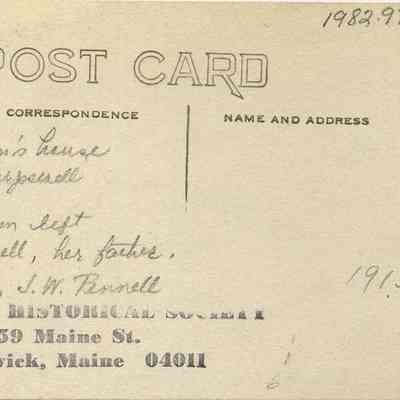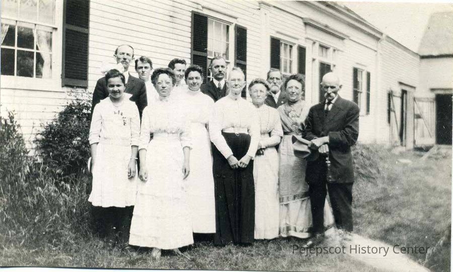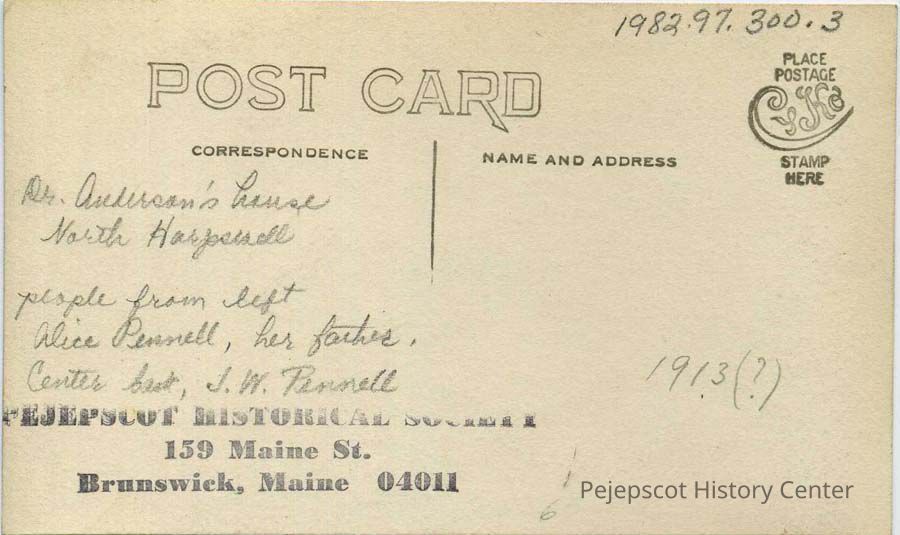 B/W photo of a group at Dr. Anderson's house in North Harpswell, with Alice Pennell at left, then her father. J.W. Pennell at center back.