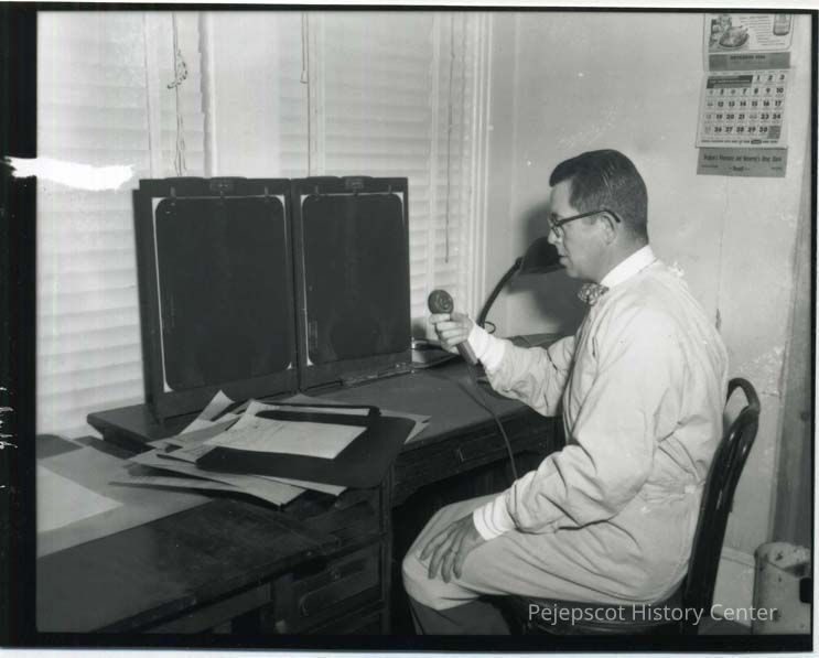 Dr. Applin sits a desk looking at x-rays in Brunswick Hospital.