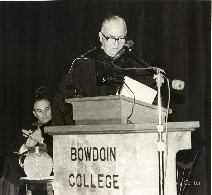 An undated black and white photograph of Dr. Asa S. Knowles (1909-1990) shows him speaking at Bowdoin College in Brunswick, Maine. Dr. Knowles was the eighth recipient of the Distinguished Bowdoin Educator Award in 1972 and the Bowdoin Prize, the college's highest honor, in 1979. Knowles graduated from Bowdoin in 1930. He was president of the University of Toledo from 1951-1958 and president of Northeastern University from 1959-1975.