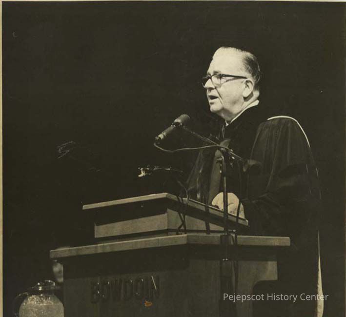 An undated black and white photograph of Dr. Asa S. Knowles (1909-1990) shows him speaking at Bowdoin College in Brunswick, Maine. Dr. Knowles was the eighth recipient of the Distinguished Bowdoin Educator Award in 1972 and the Bowdoin Prize, the college's highest honor, in 1979. Knowles graduated from Bowdoin in 1930. He was president of the University of Toledo from 1951-1958 and president of Northeastern University from 1959-1975.