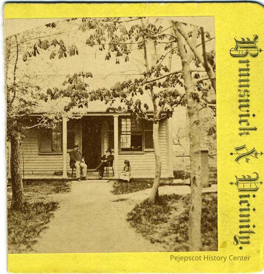 A half of a stereopticon slide showing Dr. Lincoln's office. Two men and a woman are seen sitting on the porch. The slide is mounted on yellow with the words "Brunswick & Vicinity" printed in script going down the side of the slide. Dr. John Lincoln sitting of piazza. Undated. Brunswick, Maine.