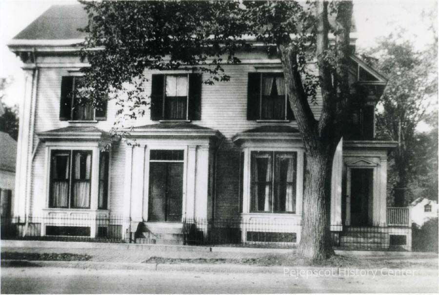 A black and white photo of Dr. M. Phillips Mason's house (the father of the donor, who was born in the home) at 156 Maine Street from 1920-1947. According to the donor, the house was built in 1876, but was torn down after World War II and as of 1980 was the site of Maine Hardware Store. The donor believes it was built by either the Skolfield or Turner shipbuilding families.