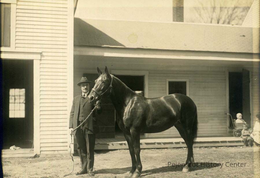 B/W photo of Dr. Robert Cole Pletts in backyard of 13 Lincoln Street. On the right side in background are Mrs. Sarah Pletts, Robert Pletts Jr. and Harold Vincent Pletts. No date.