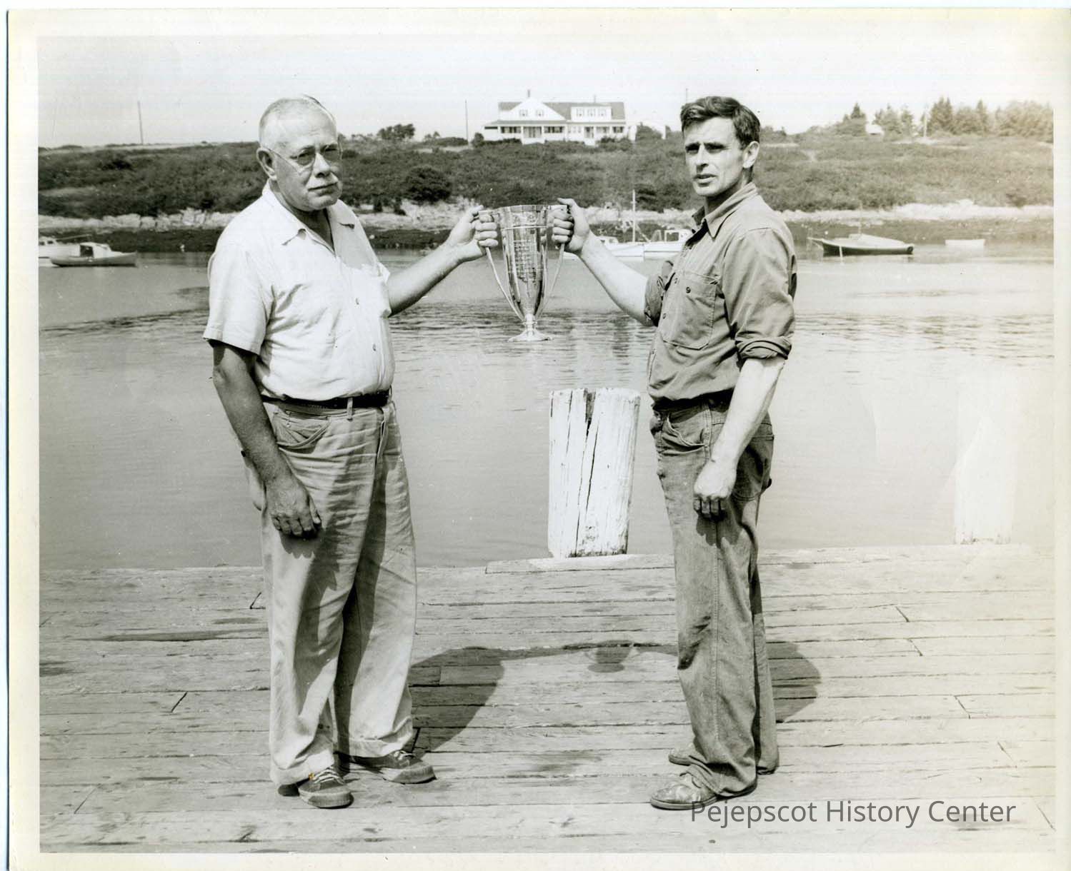 Taken at Mackeral Cove on Bailey Island. The picture shows Dr. Storz on the left and Reverend Herrick standing on a dock and holding a prize winning cup. Dr. Storz came to Bailey Island in the late 1940s. Undated