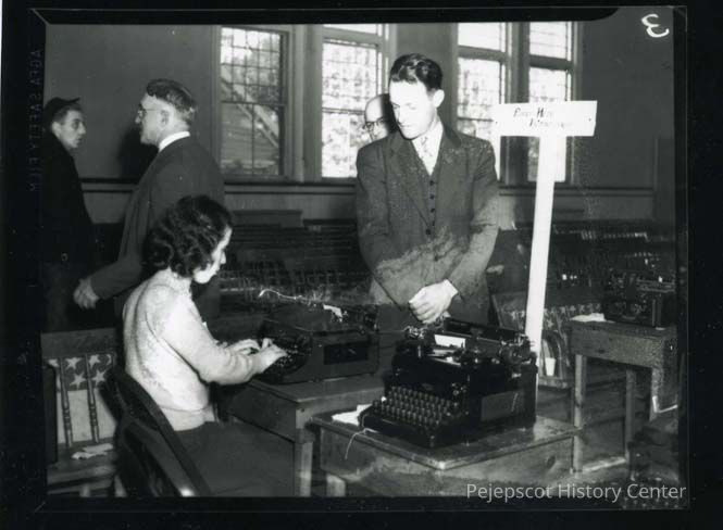 Susan Chandler sits at a typewriter taking information from a man who is registering for the draft in 1940.