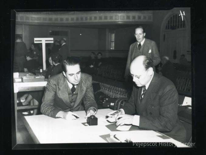 Two men sit at a table while another looks on at the draft registration of 1940.