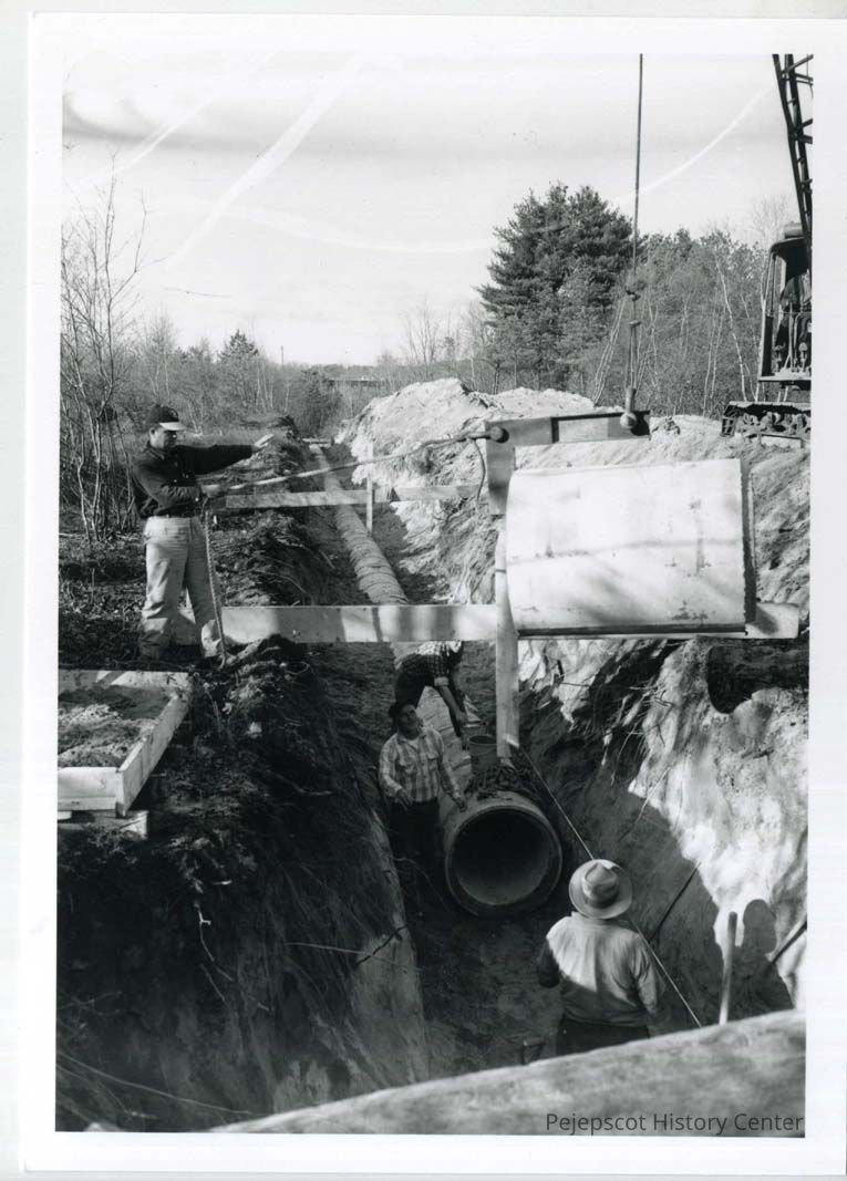 Four men lower a pipe into a drainage ditch as part of a government subsidized drainage project at Riverview Park and Jordan avenue in July, 1953.