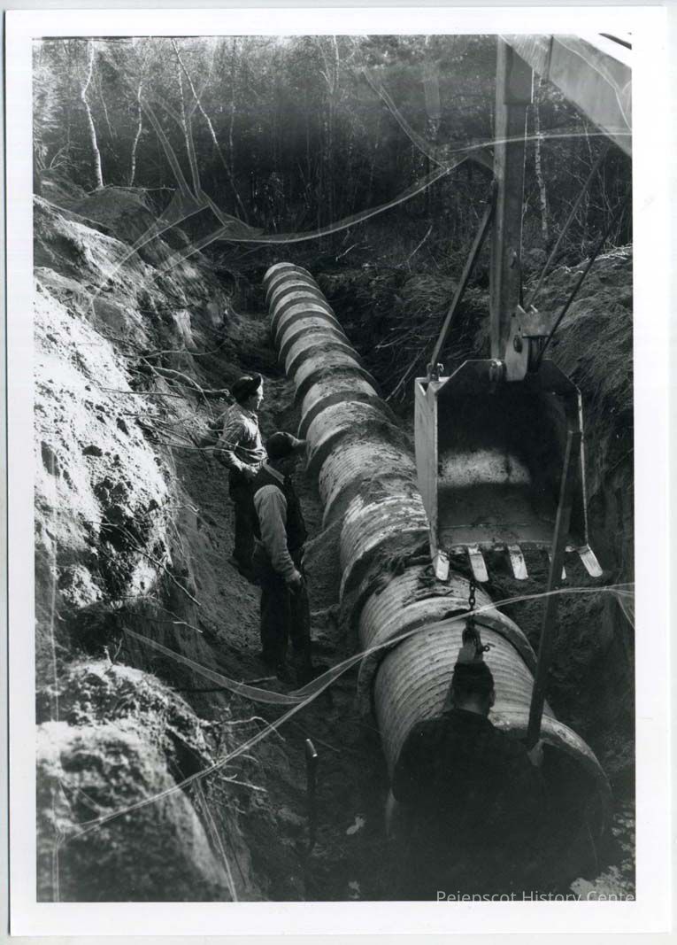 Three men work around a pipe in a drainage ditch which is part of a government subsidized drainage project at Riverview Park and Jordan avenue in July, 1953.