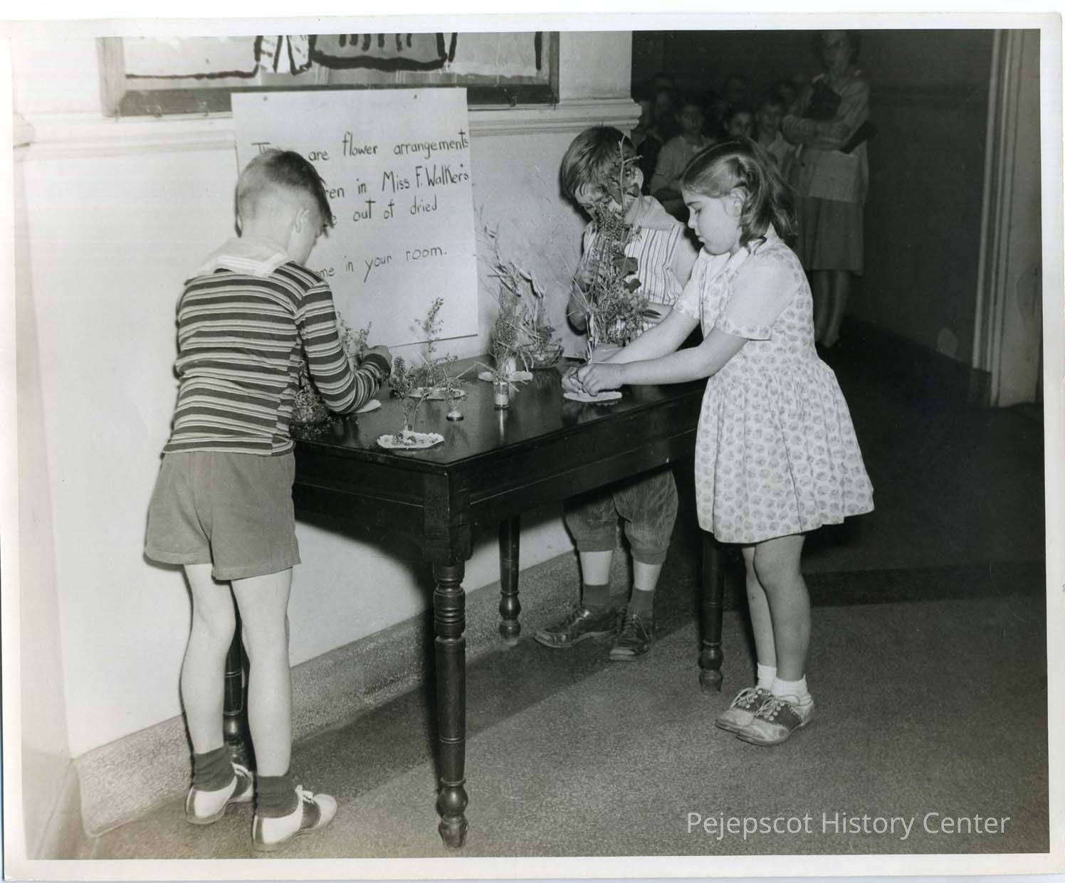 A little girl and two little boys fix dried flower arrangements at the Union Street School in the 1940s. A sign behind the flowers reads "These are flower arrangements - children in Miss F. Walker's -- out of dried --in your room." A teacher and some children stand in the background. Undated