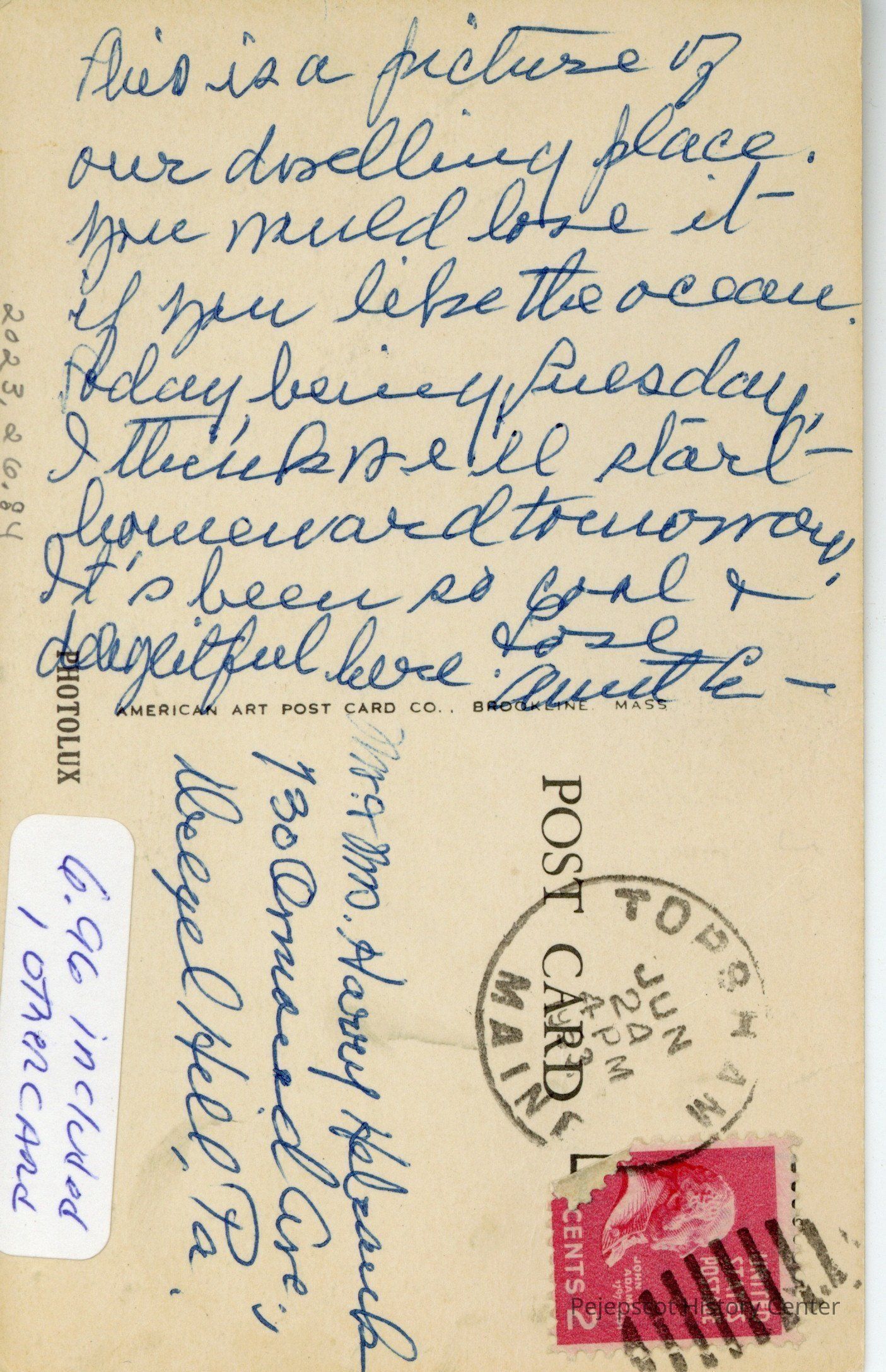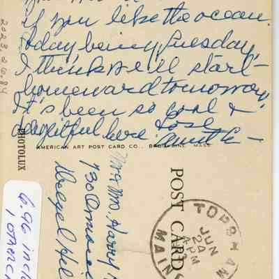 This is a picture of our dwelling place. You would love it - if you like the ocean. Today being Tuesday, I think we'll start homeward tomorrow. It's ben so cool and delightful here. Love, Aunt E.