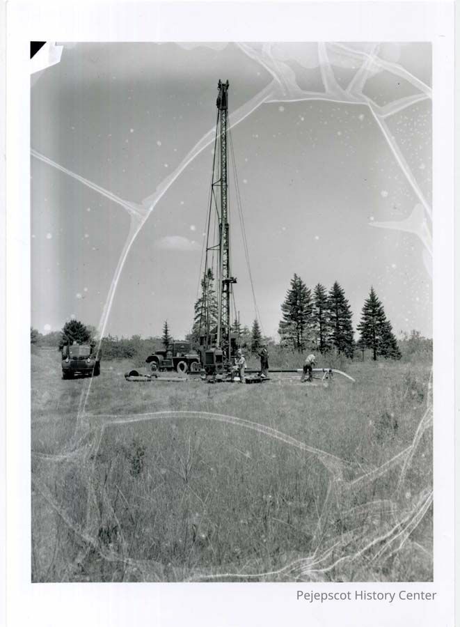 B/W photo of 2 trucks, one with well drilling equipment on it, drilling test wells for water in Topsham (Aug. 1951)