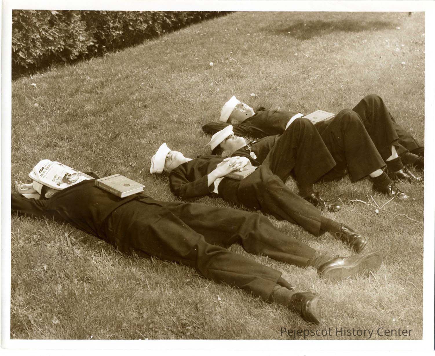 Four sailors snoozing on the grass all of whom are members of drivers ed. at BNAS. Undated