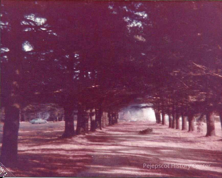 A color photograph looking down the driveway towards what remains of the Pine Spring Water Company building. 01/08/1984