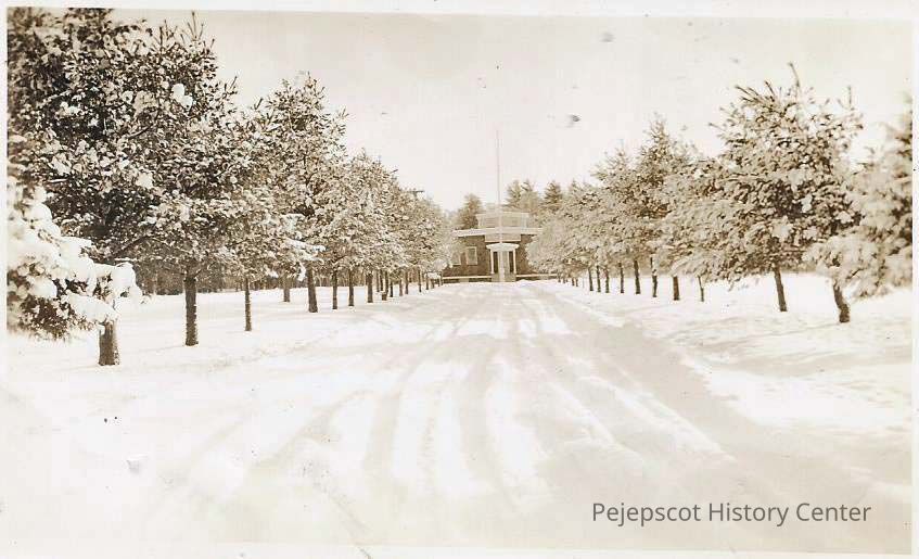 A b/w photograph of the driveway of the Pine Spring Water Company Plant in winter. Undated