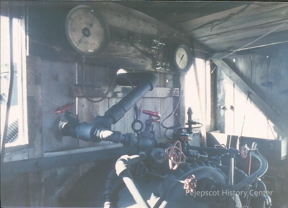 A color photograph of the driving gears, inside the cab, of the Lombard Log Hauler. Written on the back reads,