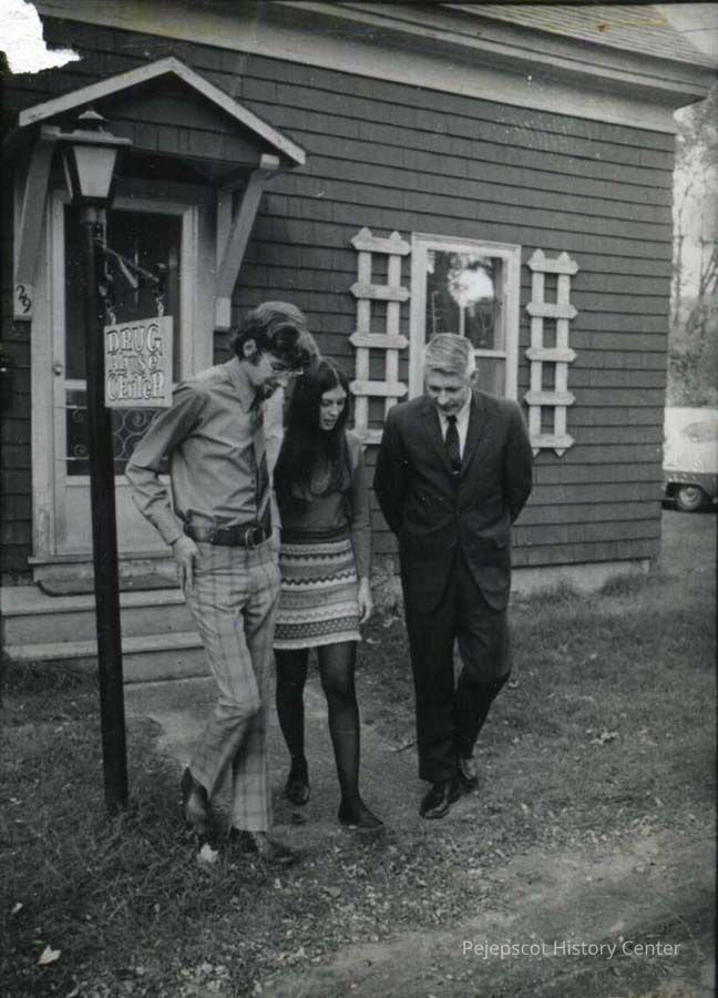 A B/W photograph of some people outside the Drub Abuse Center, 29 South Street Brunswick. Governor Kenneth Curtis and Bob and Sue Kaynor