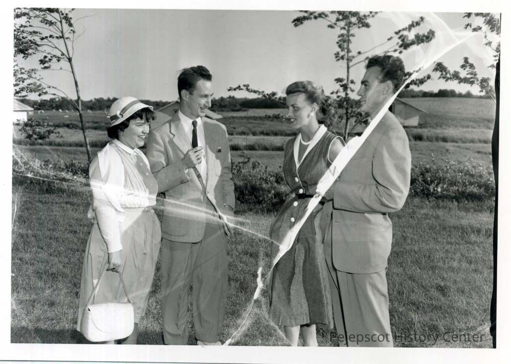 This photo shows two couples facing one another at a Rotary picnic. They are outside with fields in the background. One couple is Druscilla Congdon Cummings and Rev. John Cummings, and the other Hank Baribeau C. Henry Jr. and Betty Baribeau.