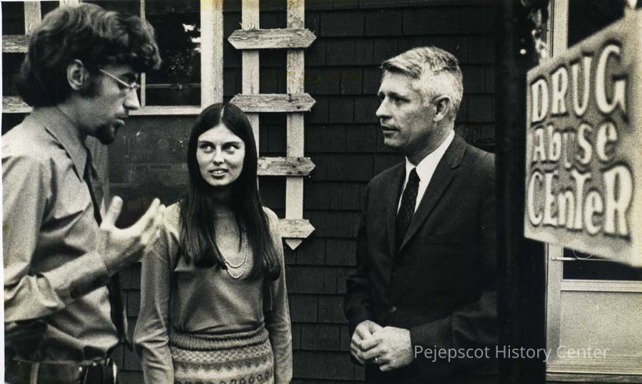 A B/W photograph of the people at the Drug Abuse Center. Governor Kenneth Curtis and Bob and Sue Kaynor