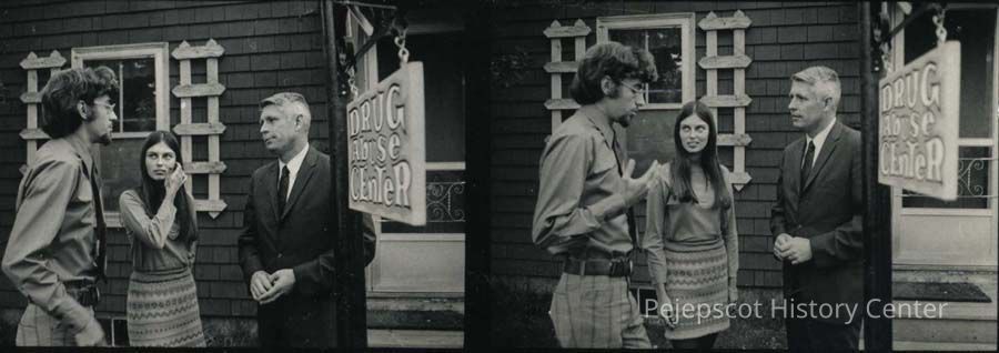 A B/W photograph of people outside the Drug Abuse Center, Brunswick. Governor Kenneth Curtis and Bob and Sue Kaynor