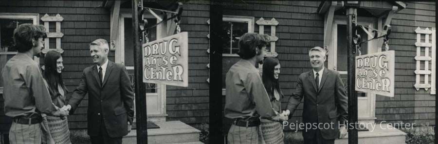 A B/W photograph of people outside the Drug Abuse Center, 29 South Street, Brunswick. Governor Kenneth Curtis and Bob and Sue Kaynor.