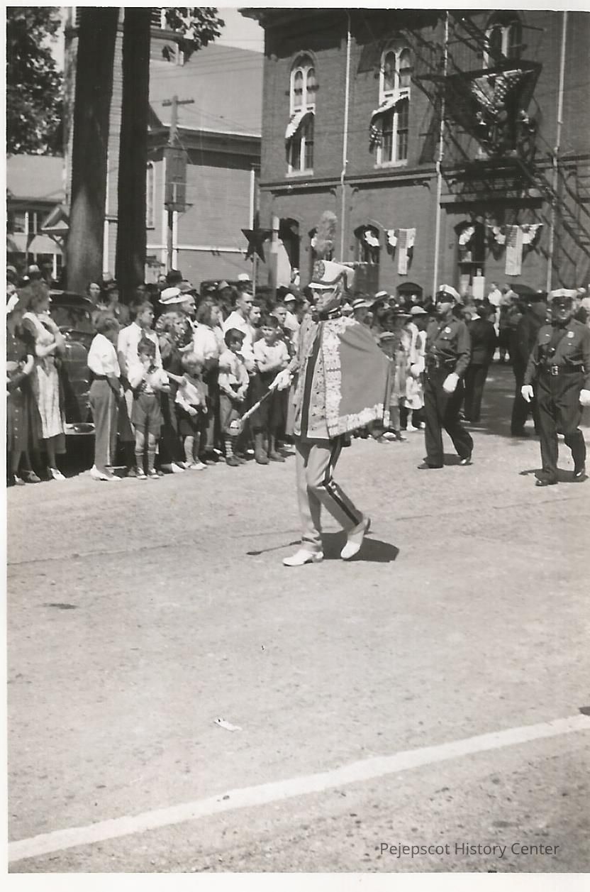 A B/W photo of a drum major leading the fire department at the corner of Maine and Pleasant Streets in Brunswick's 200th Anniversary parade. Undated