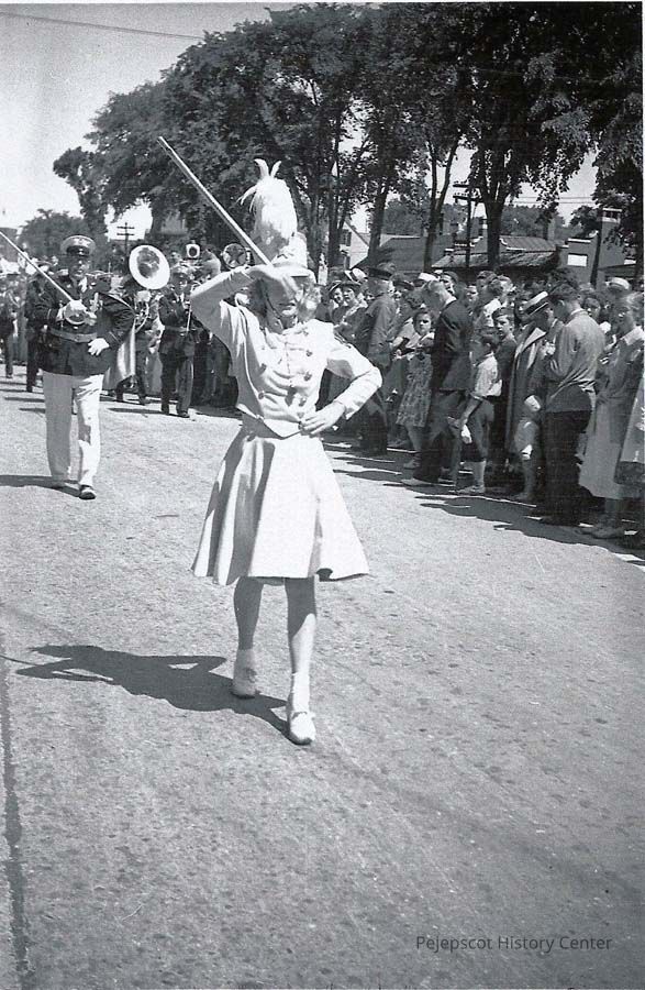 A B/W photo of a majorette marching down Maine Street. (Appears to be the same as 2016.380.41) UndatedLexicon