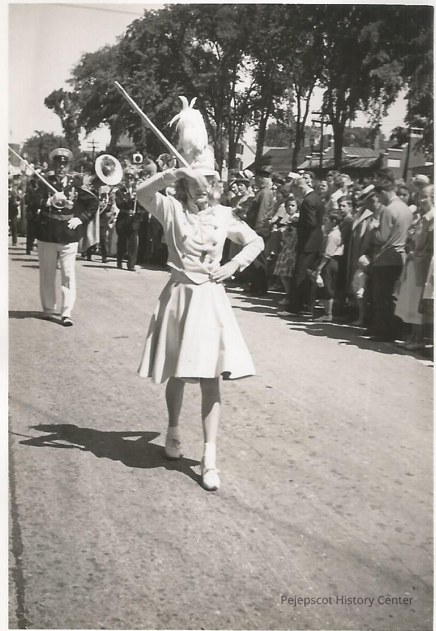 A B/W photo of a drum majorette in Brunswick's 200th Anniversary parade. Undated