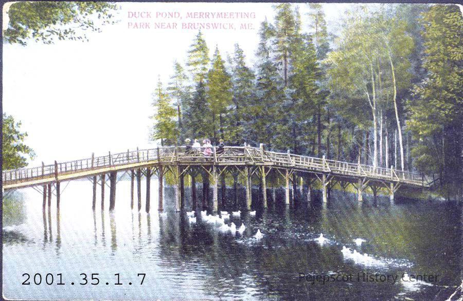 Colored postcard of the Duck Pond at Merrymeeting Park, Brunswick, ME.