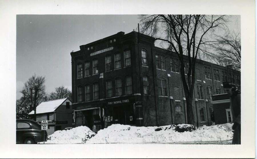 B/W photo of the old Dunlap Block on Maine Street.